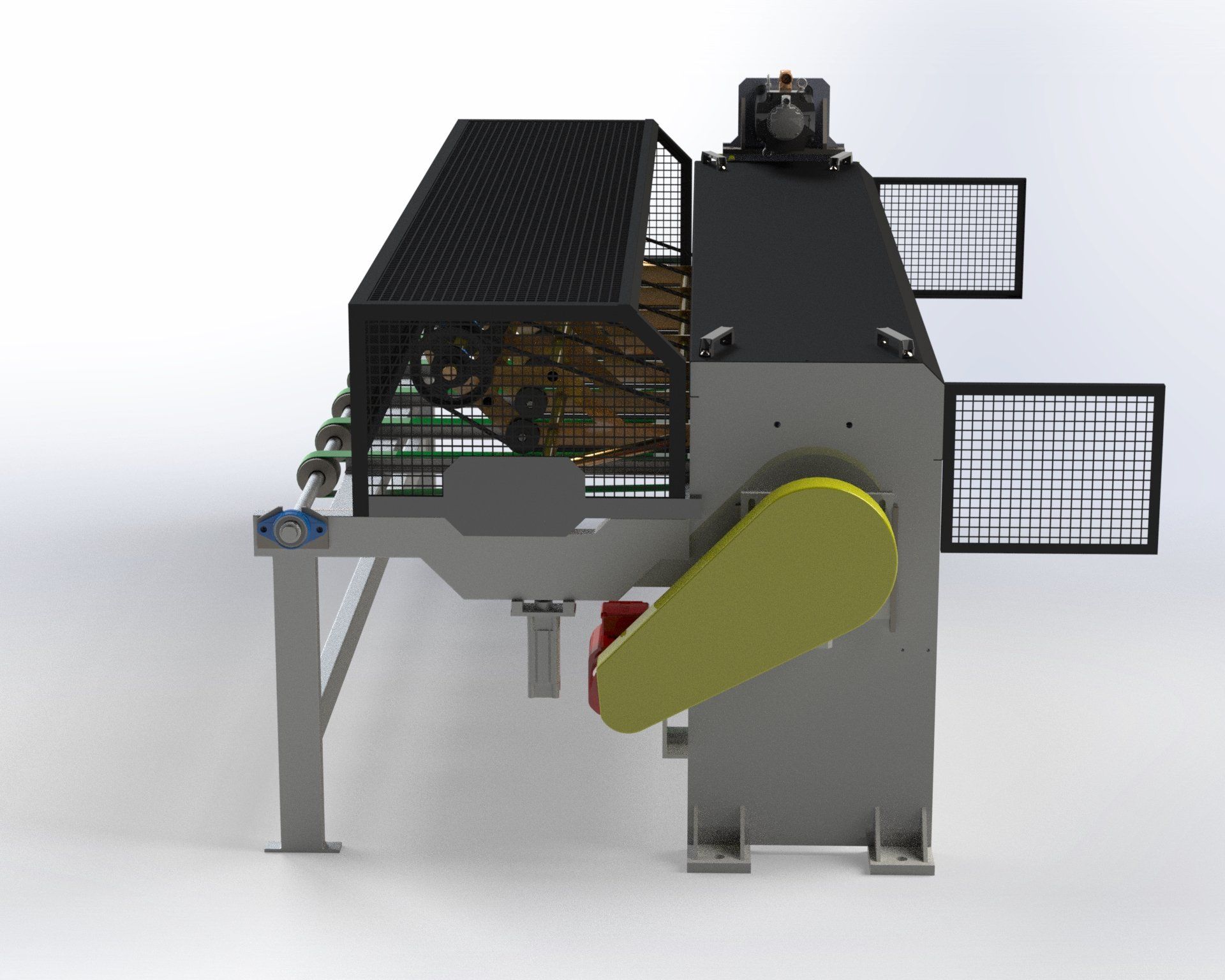 A função desta máquina é guilhotinar/cortar lâminas de compensado em um determinado padrão de medida, por um rolo contendo 04 facas.